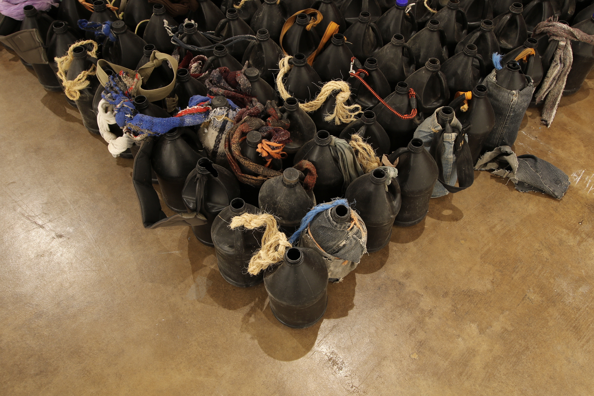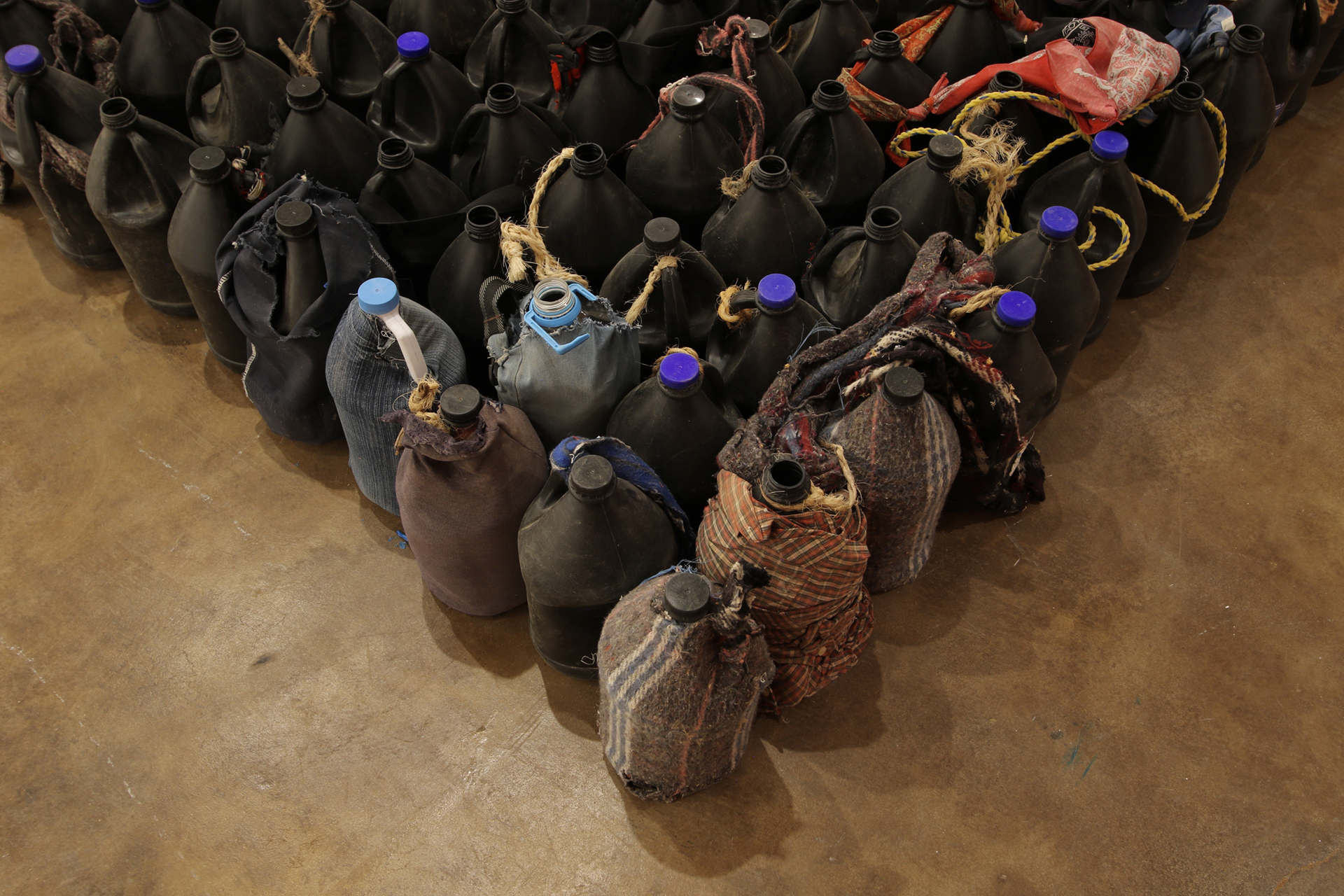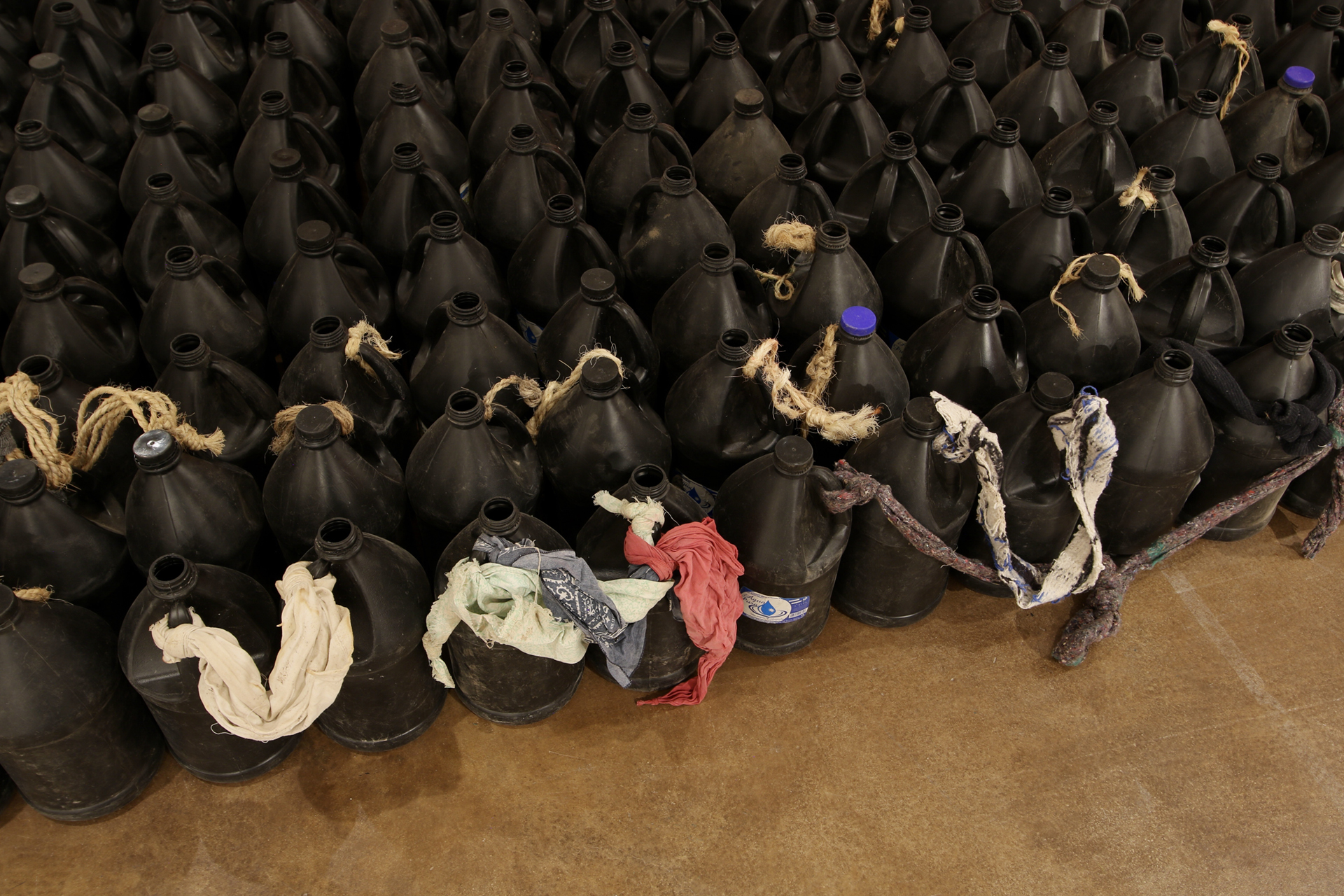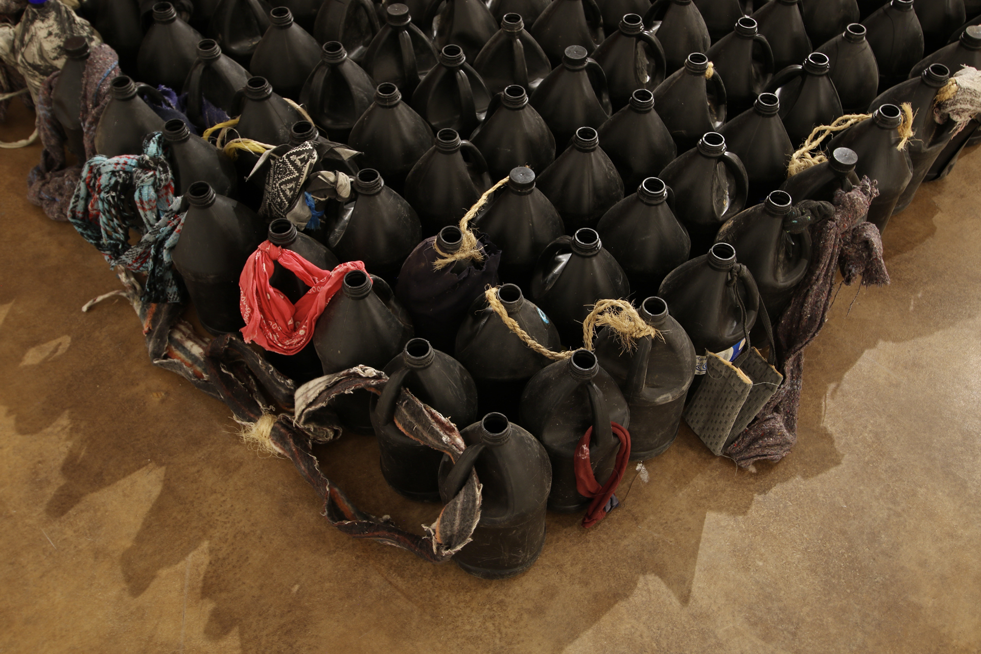 On March 9, 2022, I met the photographer Tom Kiefer when I stopped in the border town of Ajo and visited the gallery where his work is exhibited. Tom needed assistance with hanging one of the photographs in his studio and I agreed to help. The image depicted fifteen black water bottles wrapped in cloth. I told Tom that I had wanted to include an installation using a large number of these bottles in my upcoming exhibition, but I didn't have enough in my own collection. He told me to follow him and led me to a closet where he had 1,750 black water bottles. I asked him if I could borrow them for my exhibit.