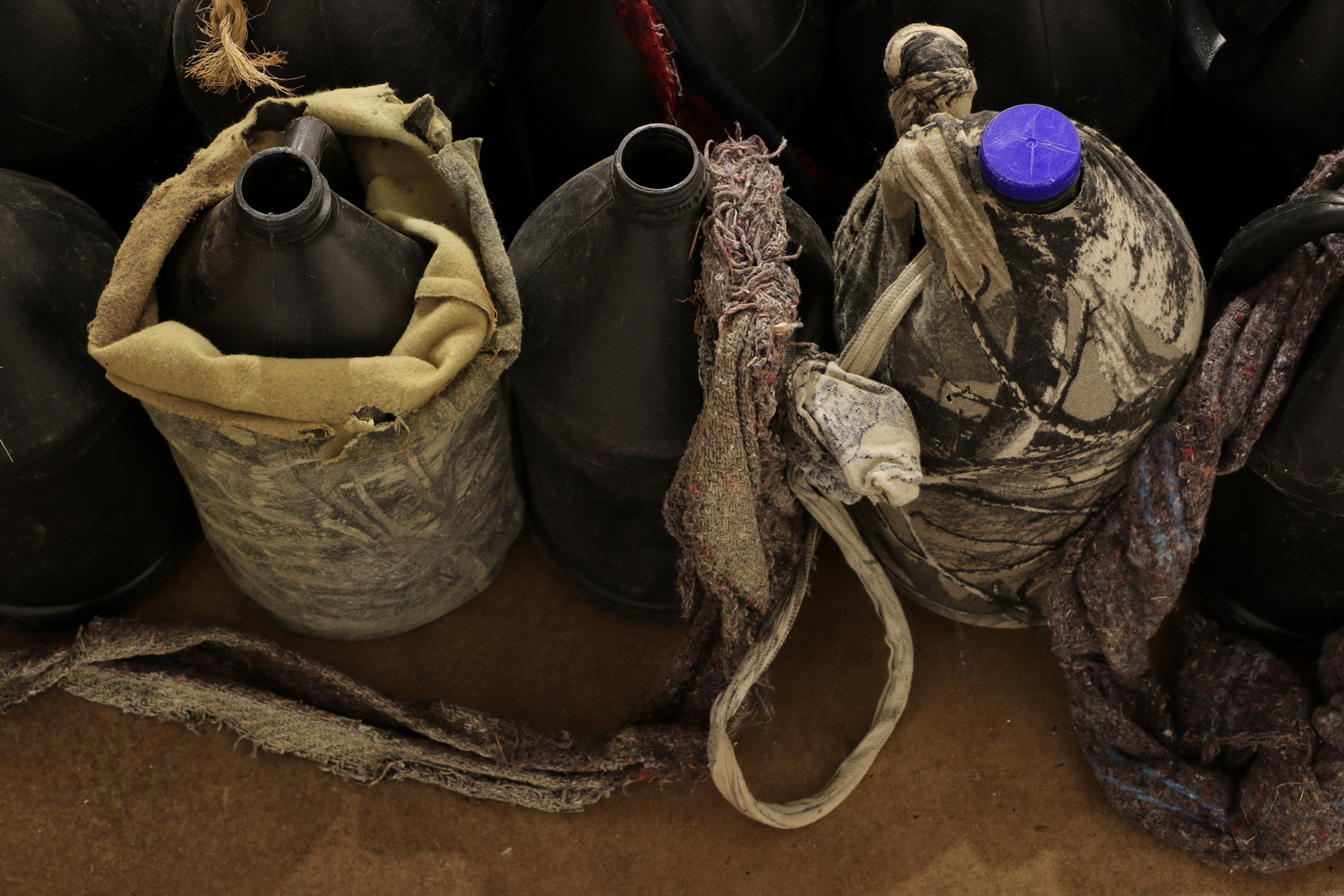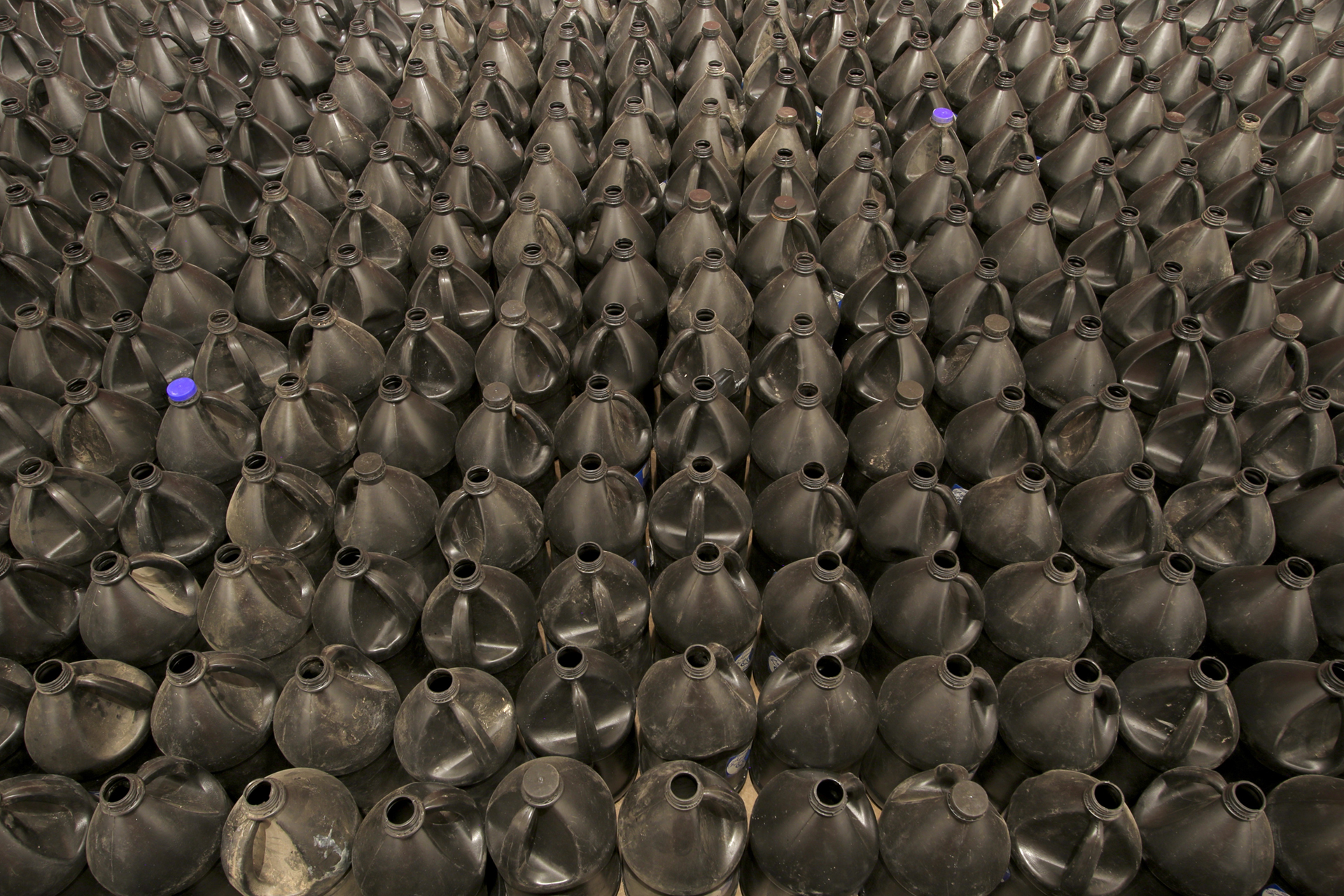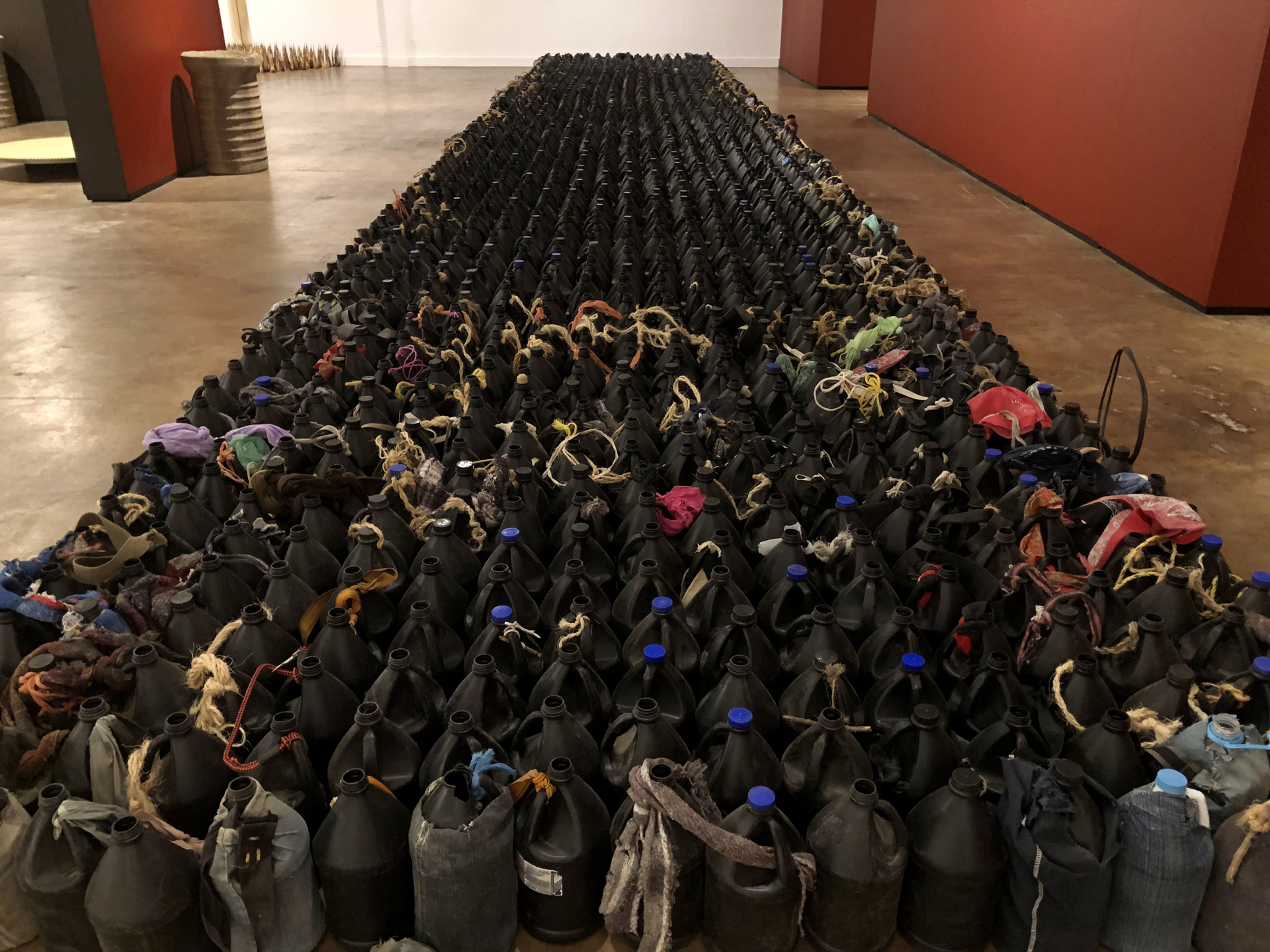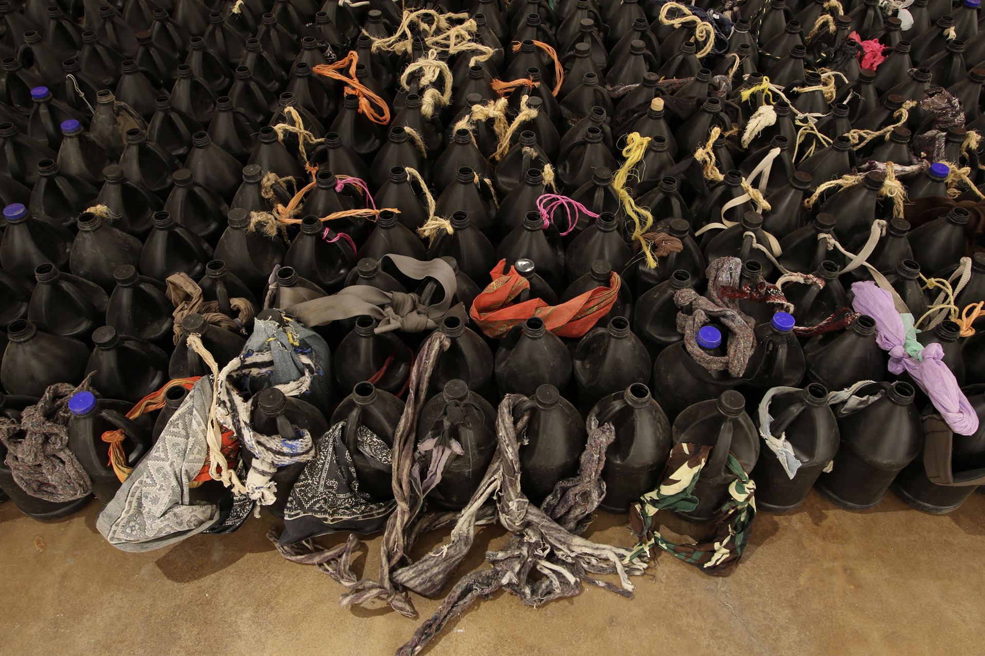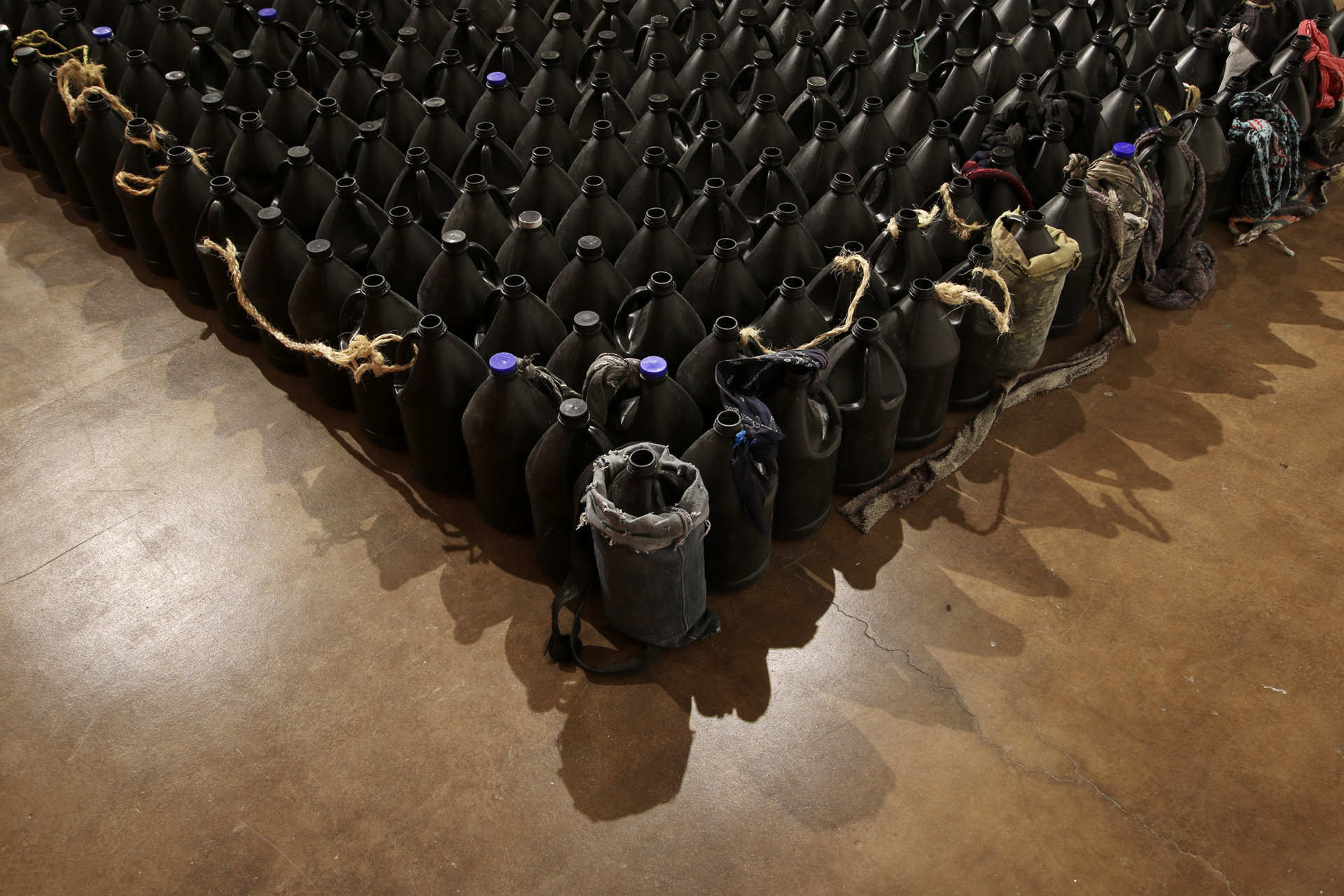 On March 9, 2022, I met the photographer Tom Kiefer when I stopped in the border town of Ajo and visited the gallery where his work is exhibited. Tom needed assistance with hanging one of the photographs in his studio and I agreed to help. The image depicted fifteen black water bottles wrapped in cloth. I told Tom that I had wanted to include an installation using a large number of these bottles in my upcoming exhibition, but I didn't have enough in my own collection. He told me to follow him and led me to a closet where he had 1,750 black water bottles. I asked him if I could borrow them for my exhibit.