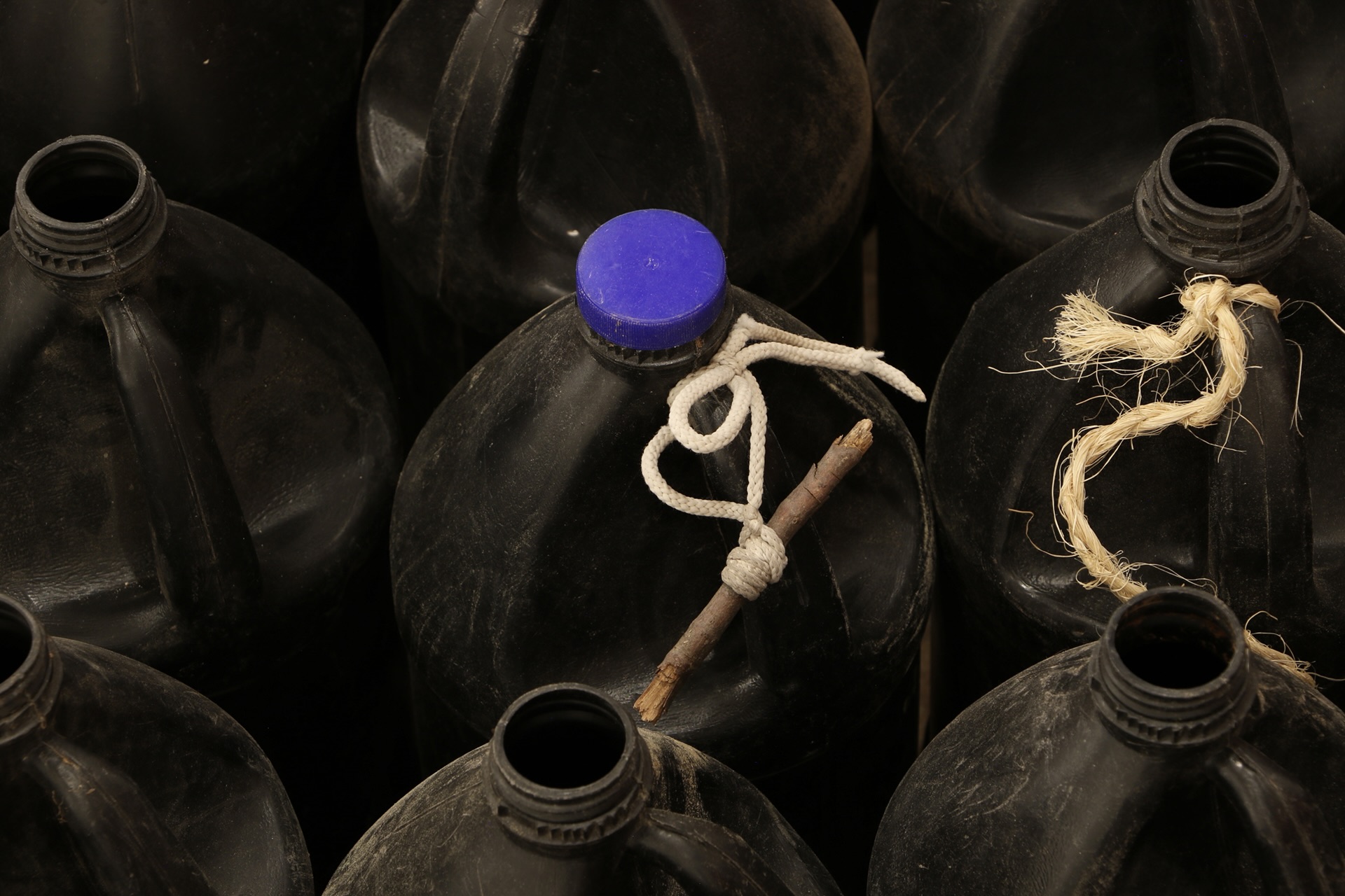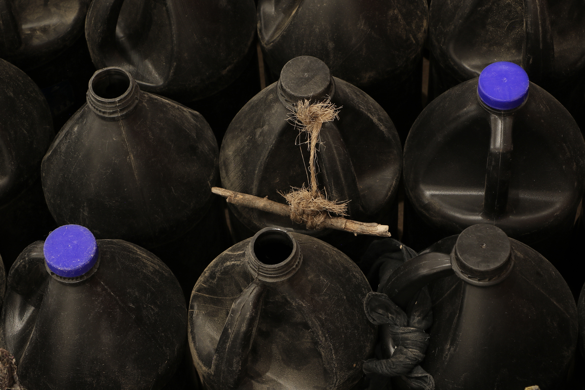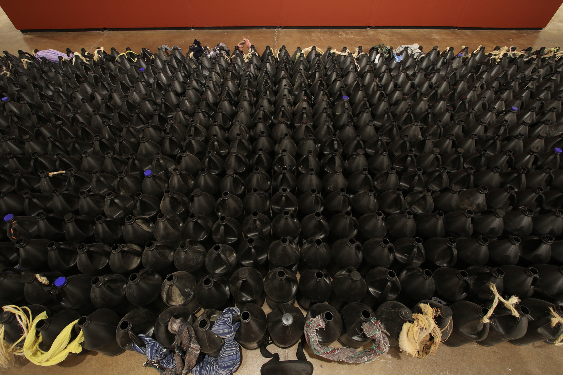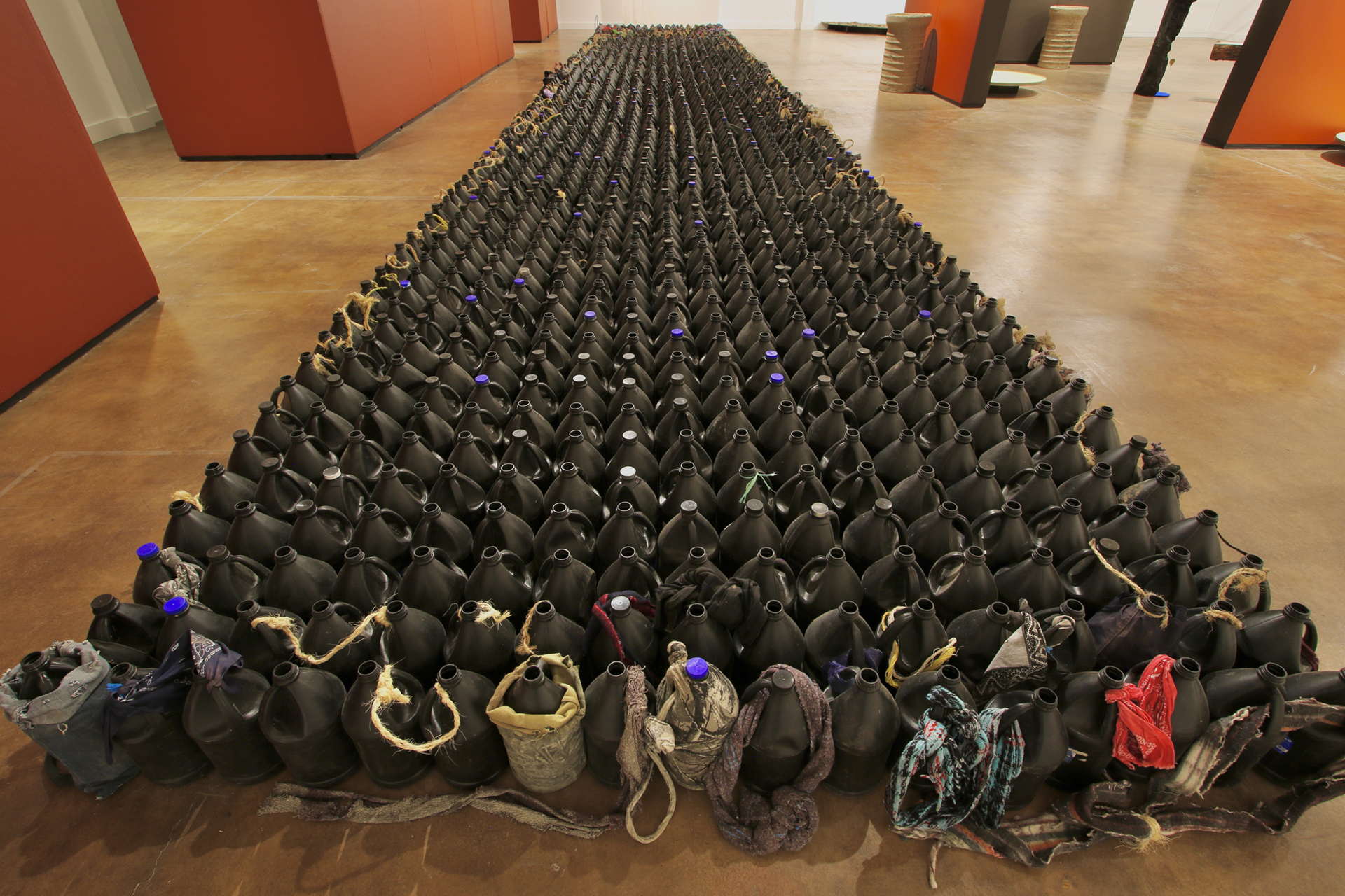 On March 9, 2022, I met the photographer Tom Kiefer when I stopped in the border town of Ajo and visited the gallery where his work is exhibited. Tom needed assistance with hanging one of the photographs in his studio and I agreed to help. The image depicted fifteen black water bottles wrapped in cloth. I told Tom that I had wanted to include an installation using a large number of these bottles in my upcoming exhibition, but I didn't have enough in my own collection. He told me to follow him and led me to a closet where he had 1,750 black water bottles. I asked him if I could borrow them for my exhibit.