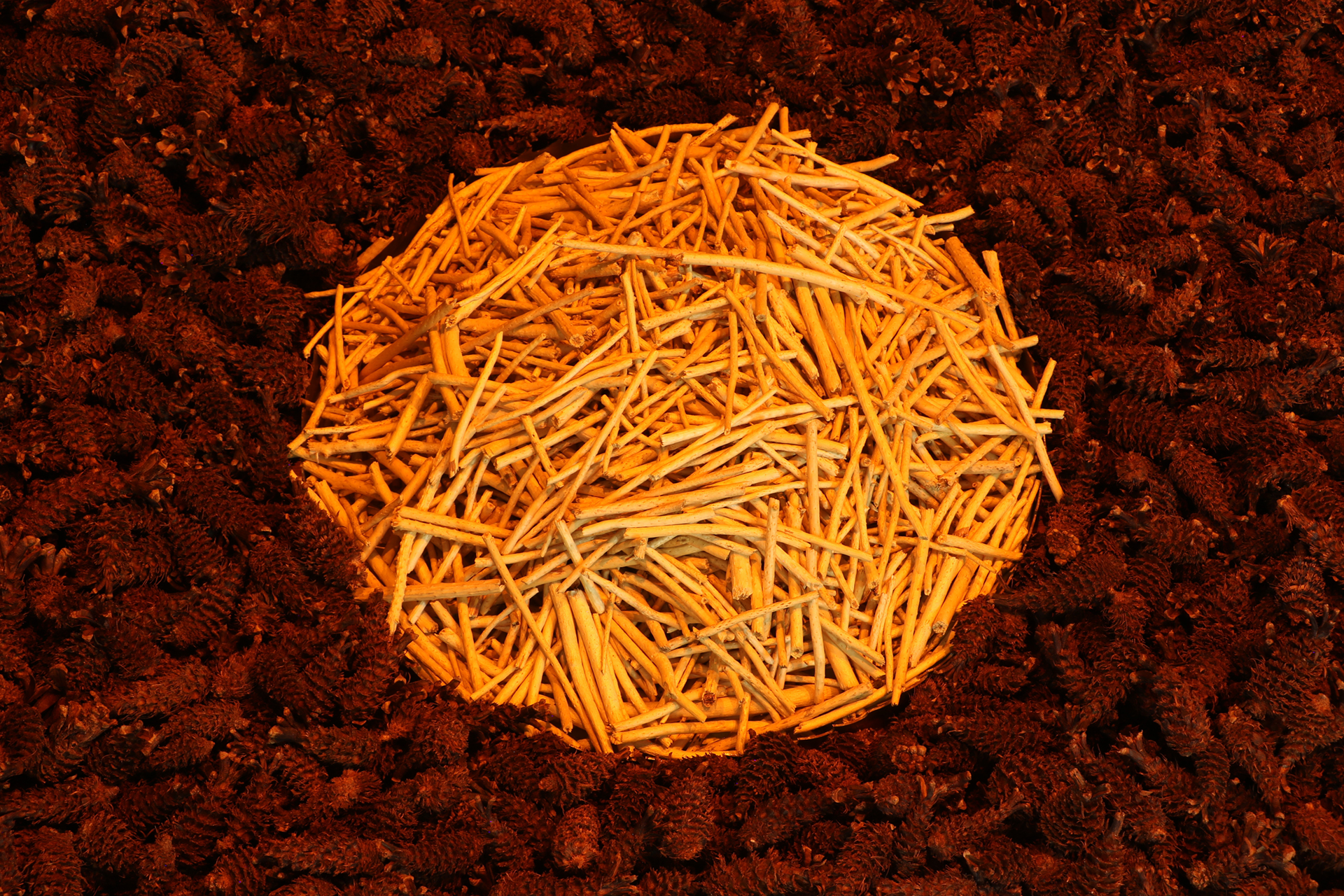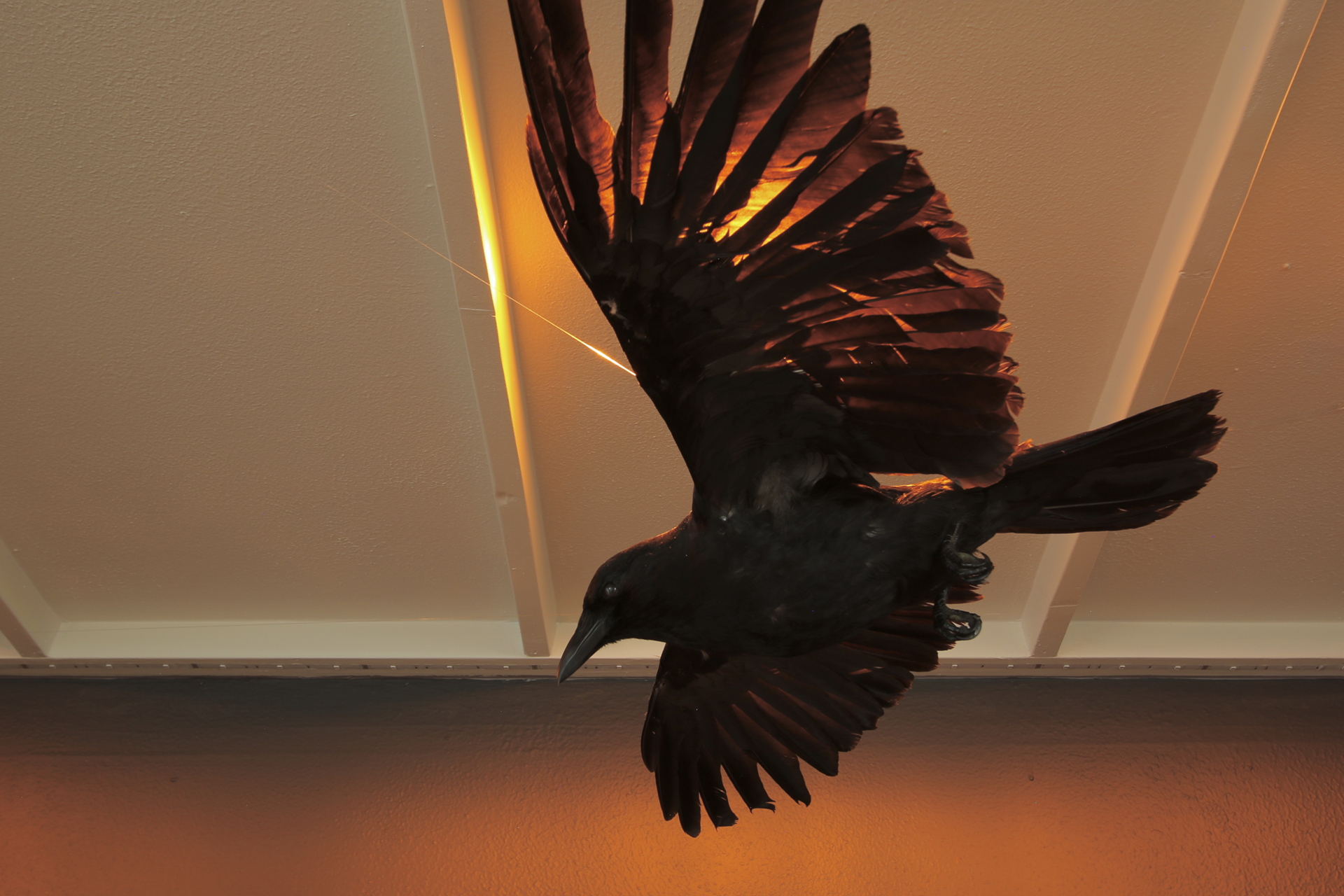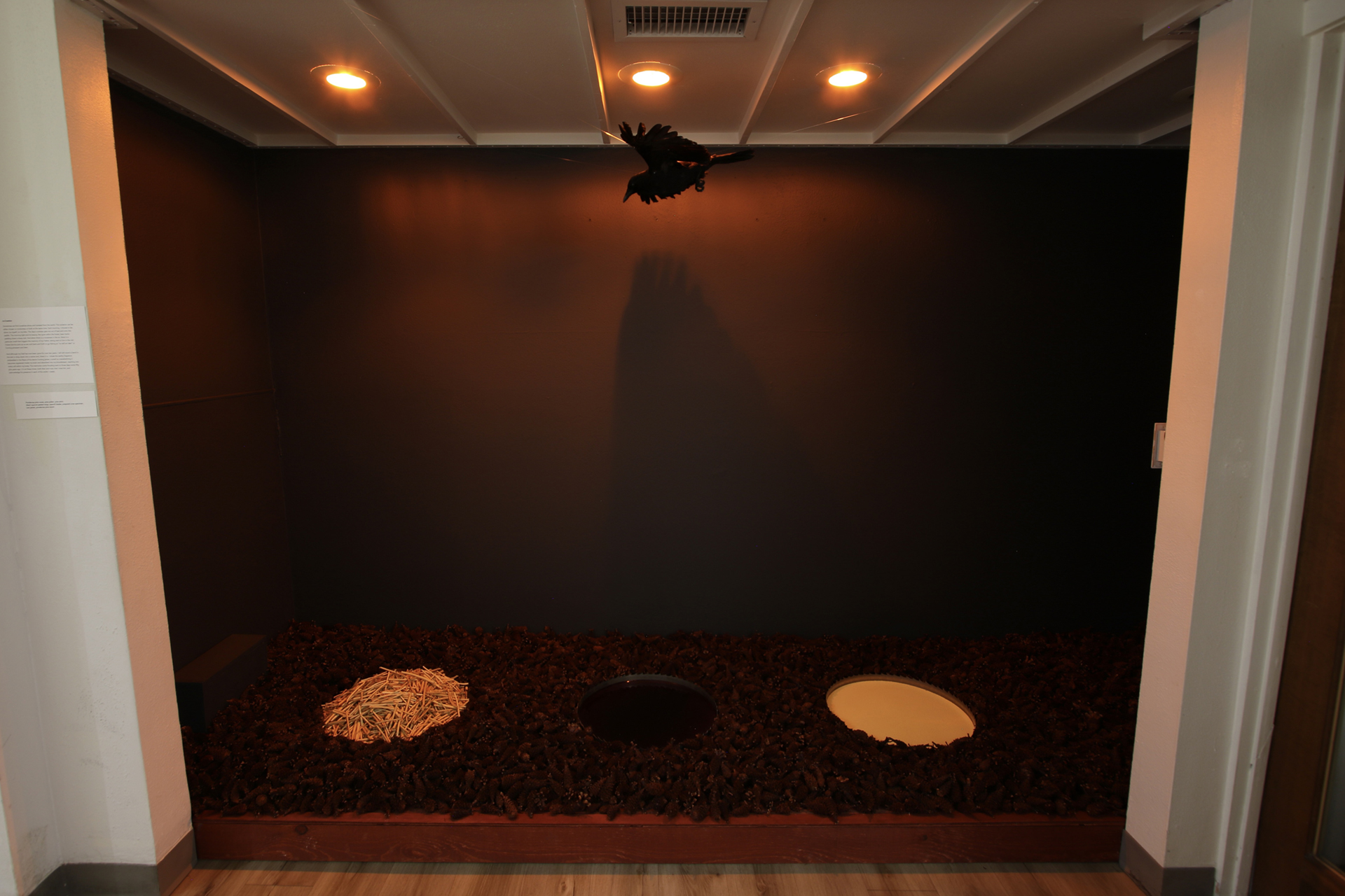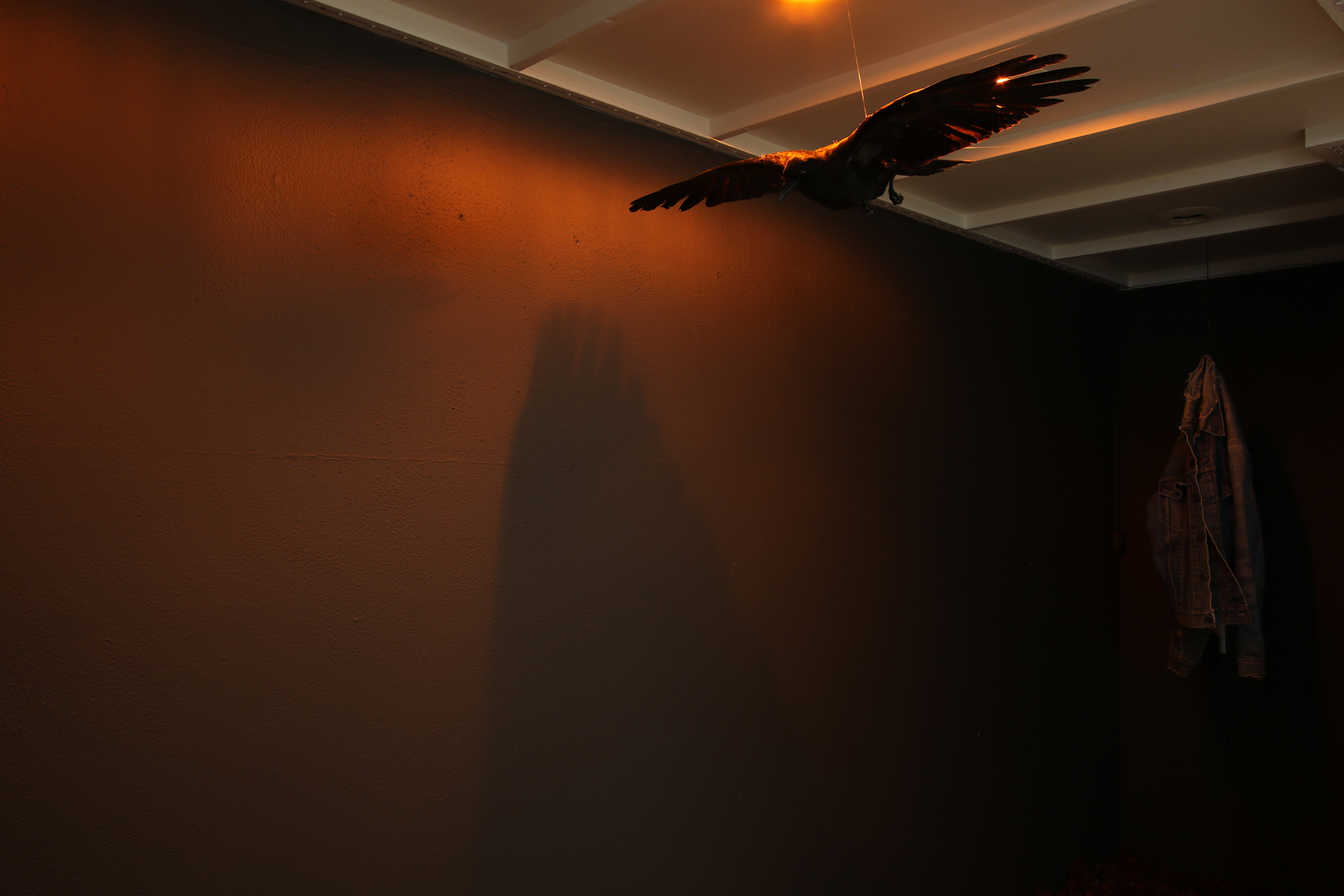 Materials: Ponderosa pine wood, cones, pitch, pollen and peeled twigs, sawmill blades, prepared crow specimen, my Dad's Levi denim jacket, orange lights