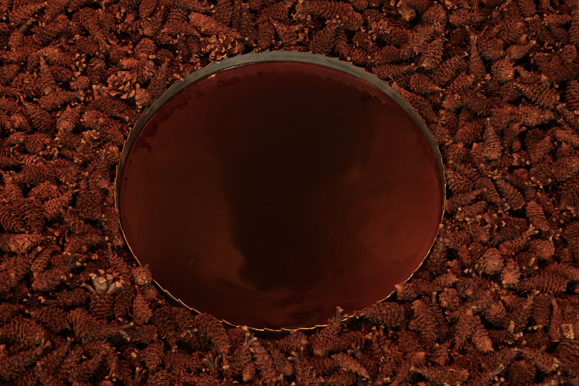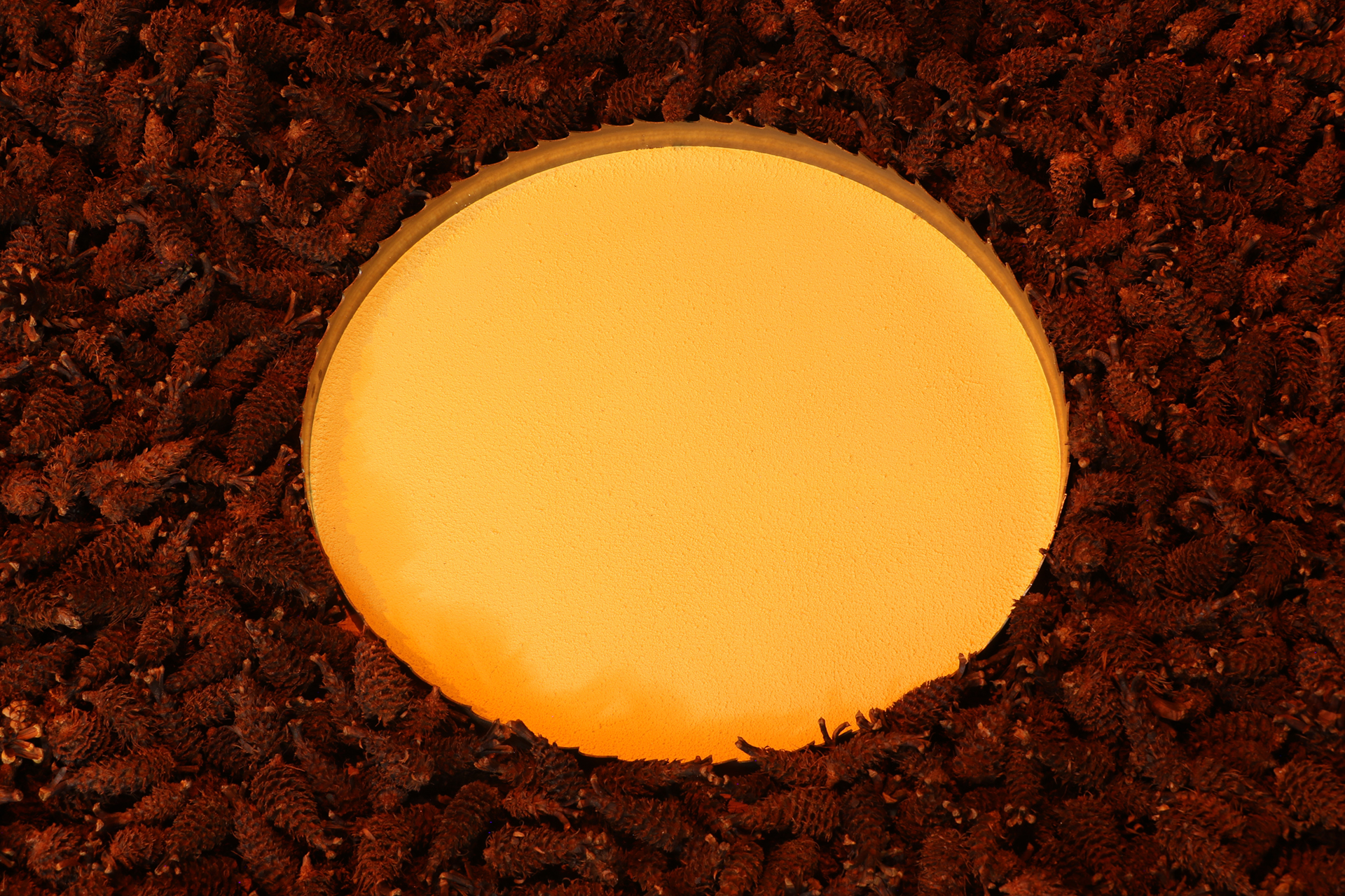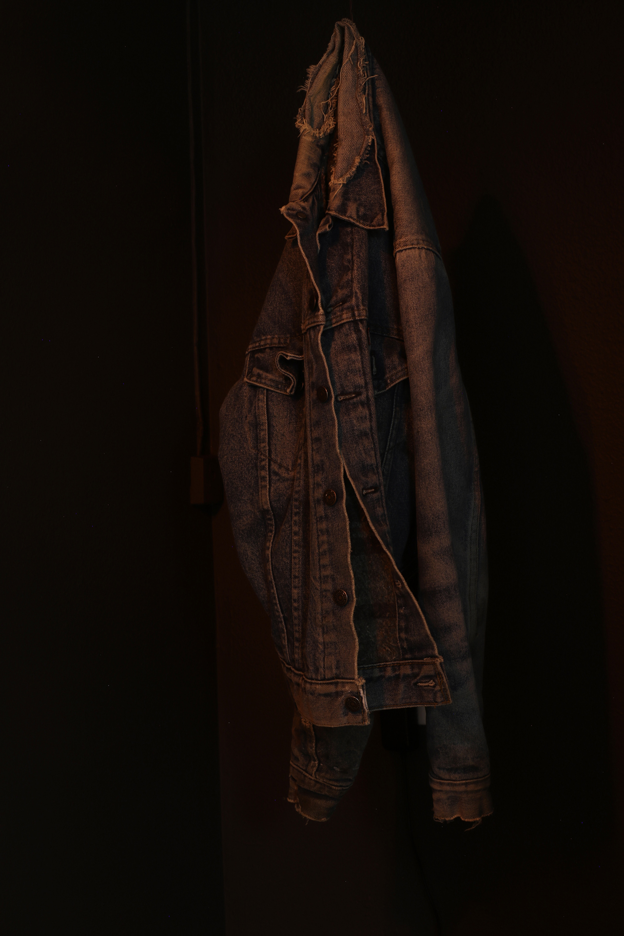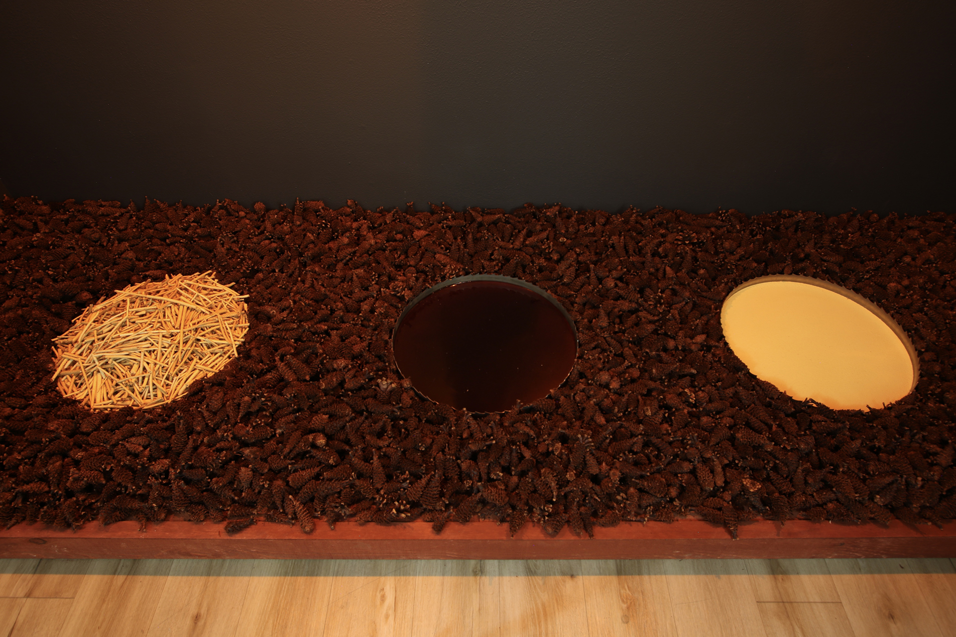 Materials: Ponderosa pine wood, cones, pitch, pollen and peeled twigs, sawmill blades, prepared crow specimen, my Dad's Levi denim jacket, orange lights