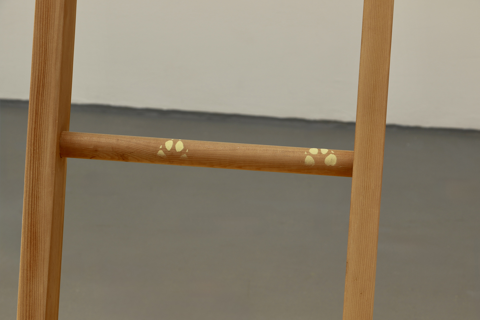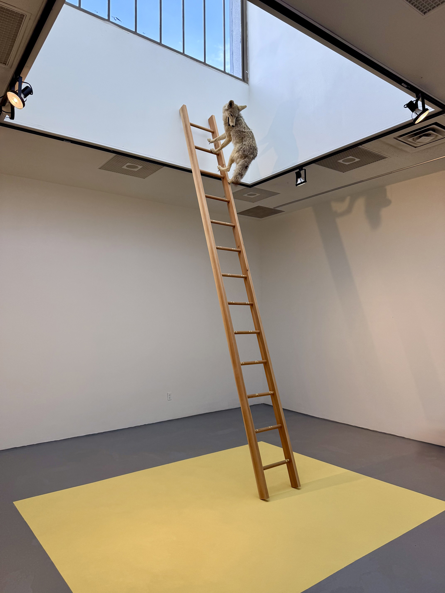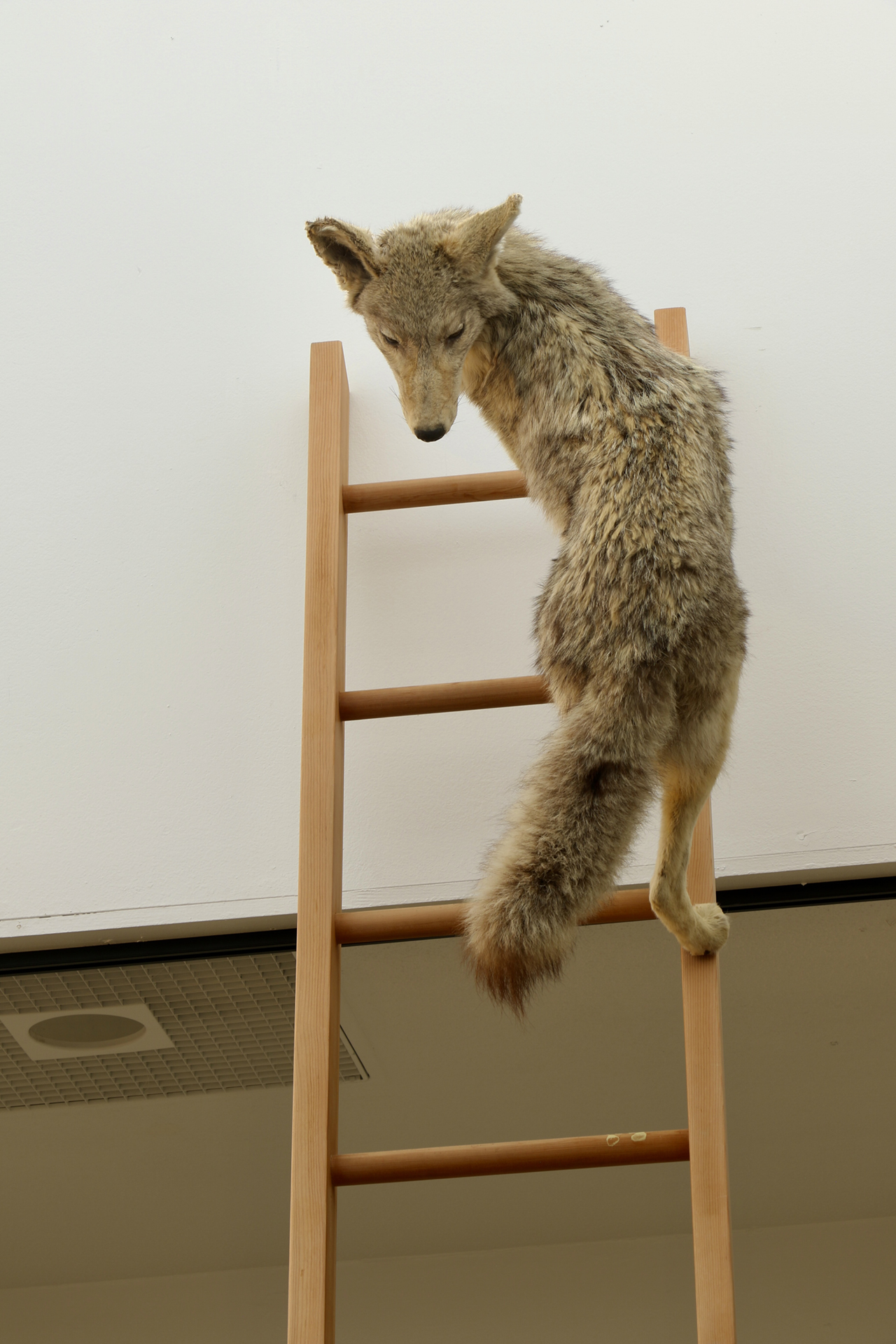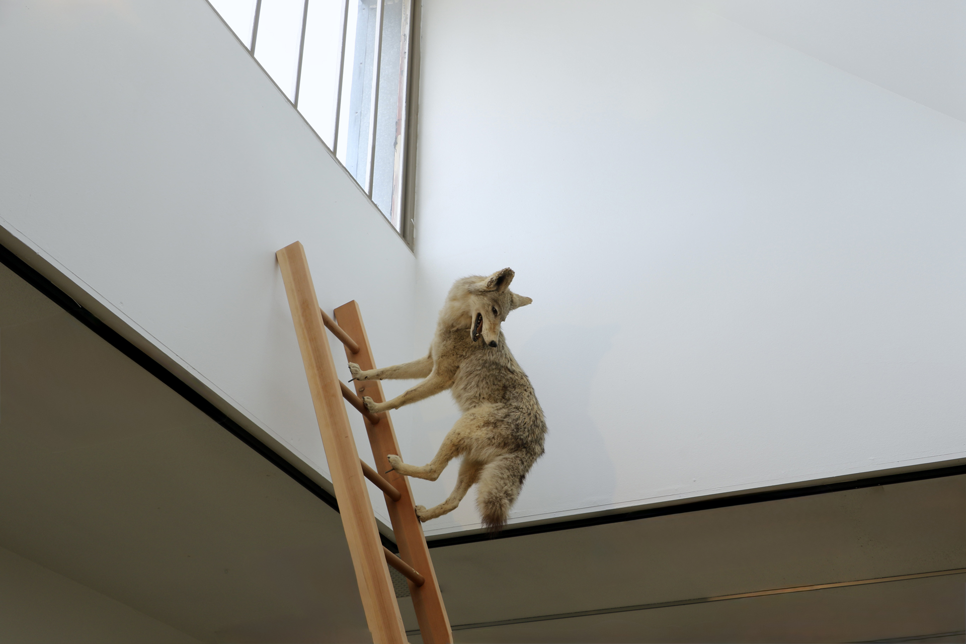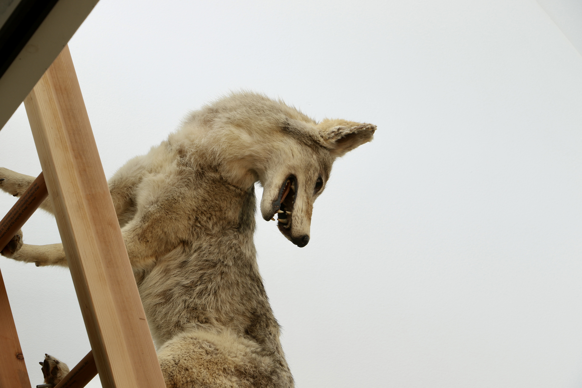 Materials: Wooden ladder, prepared coyote specimen and scat, pine pollen, paint, pedestal